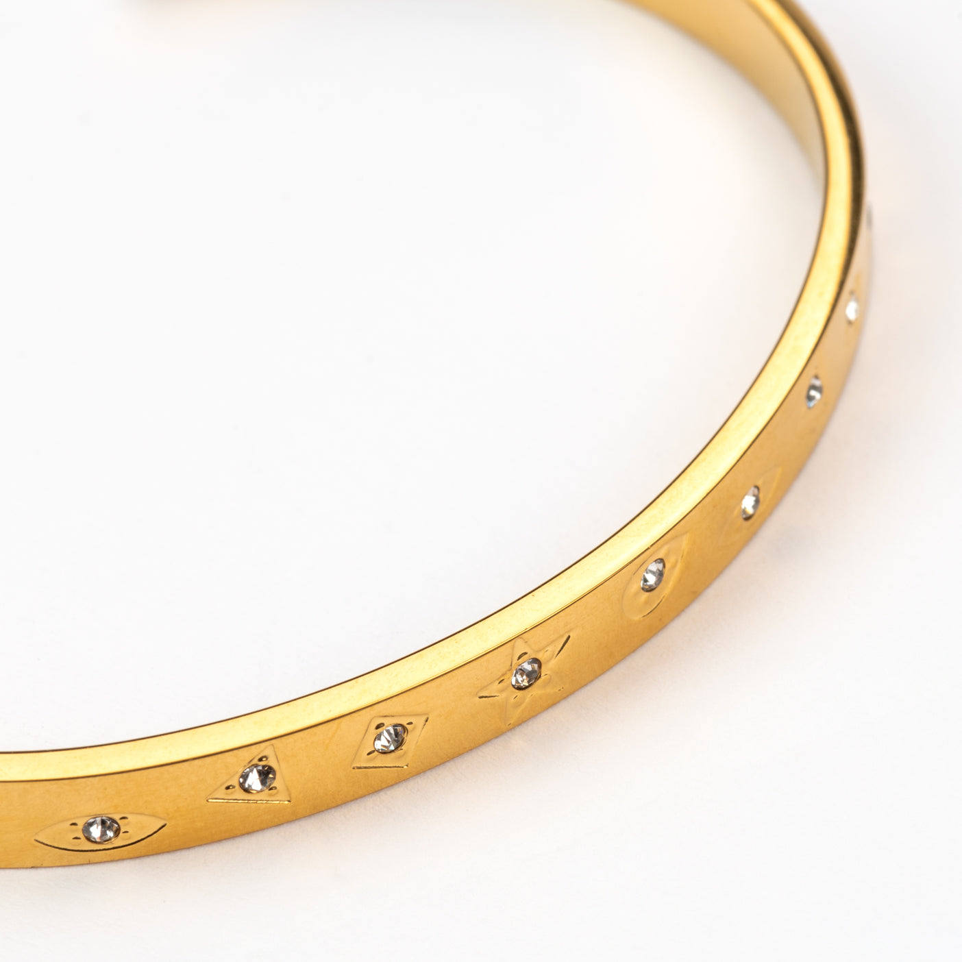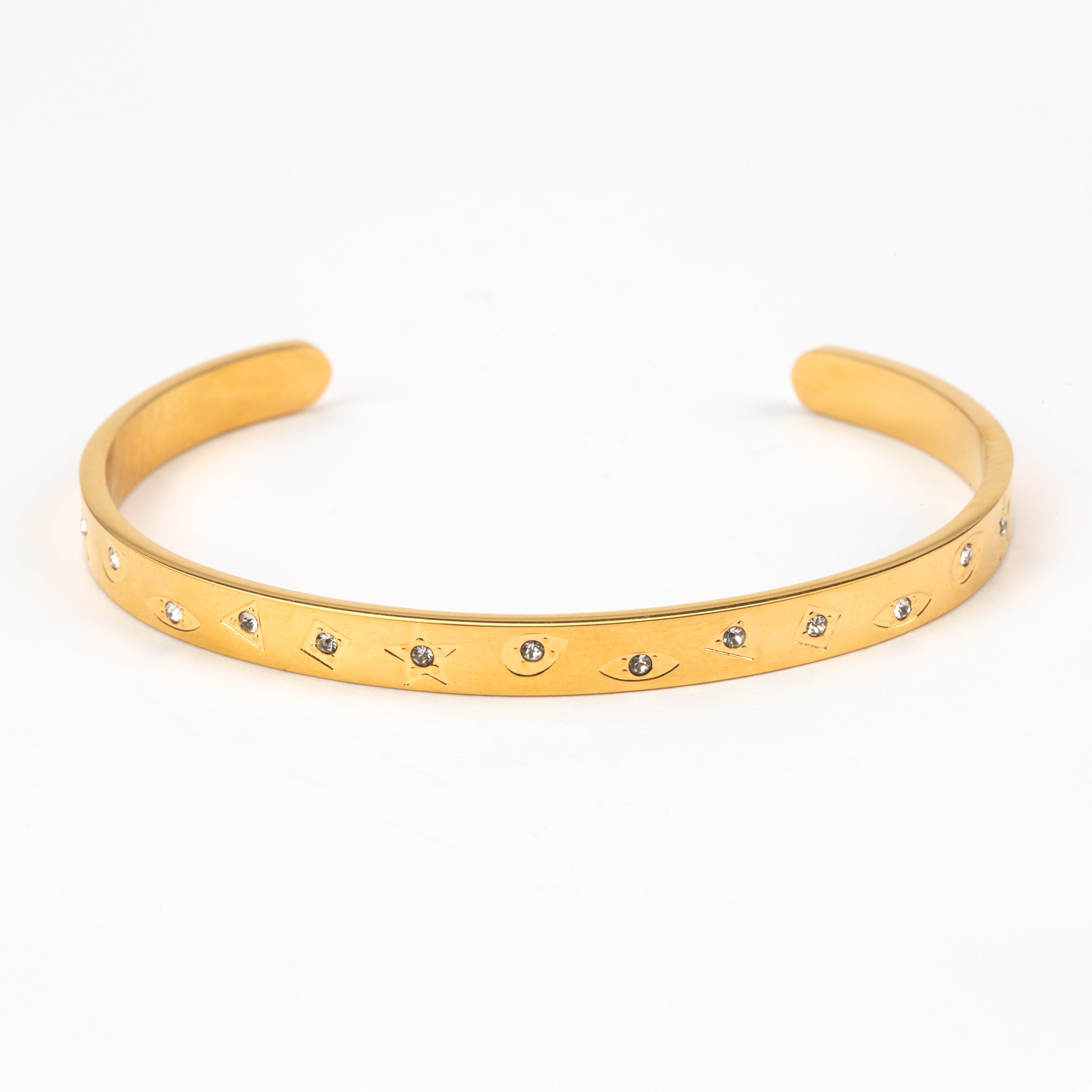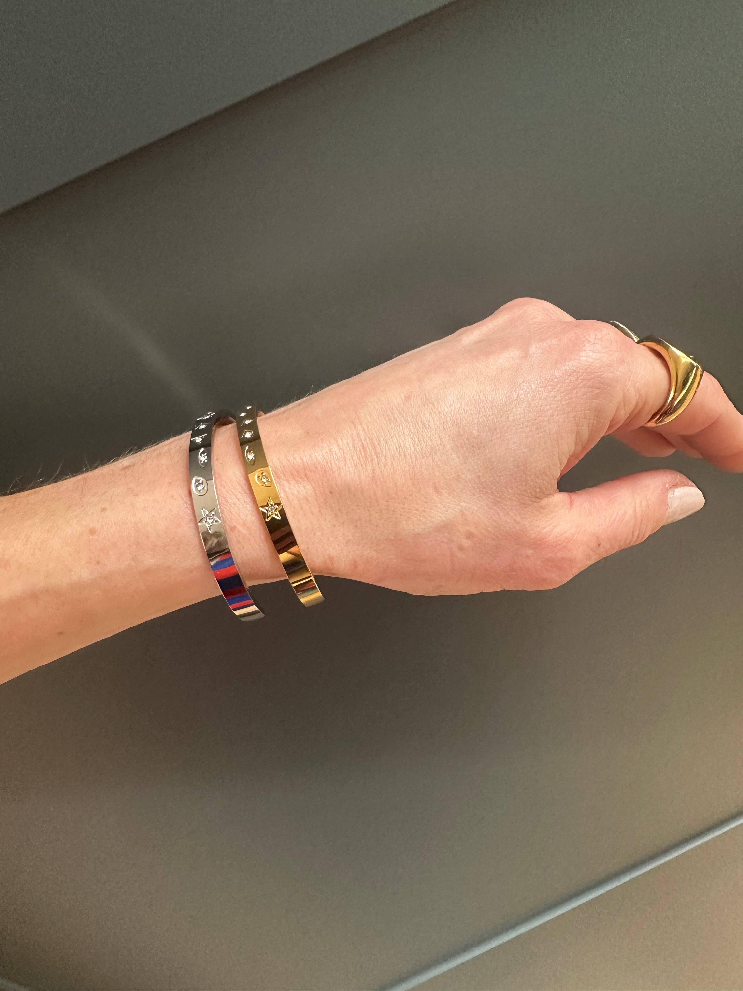 Subtle clear rhinestones and stars adding some subtle detail. Measures 0.5cm in width. An open bangle which will slip on to your wrist. Also available in silver. Made with gold plated stainless steel. Bracelet diameter is 6.5cm.