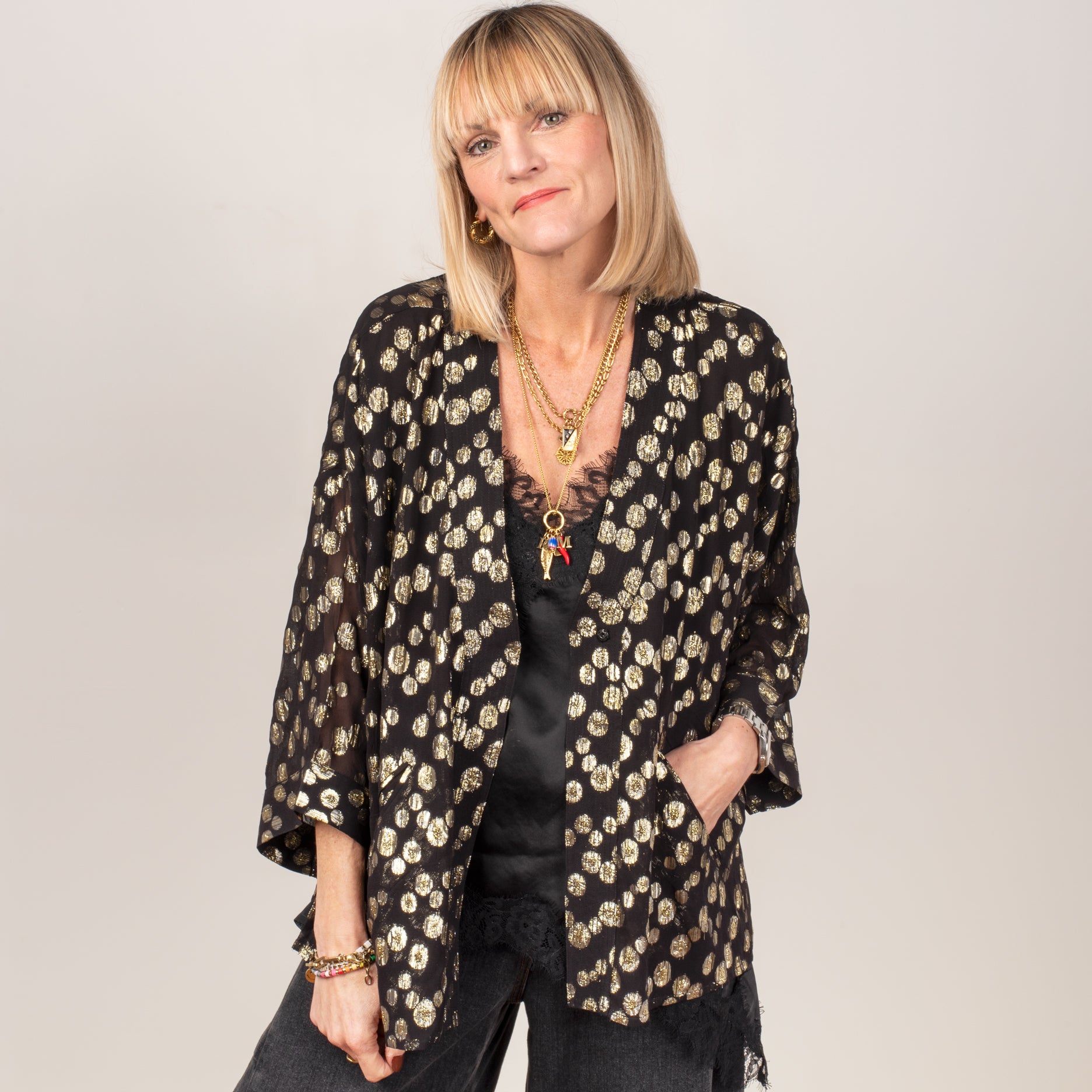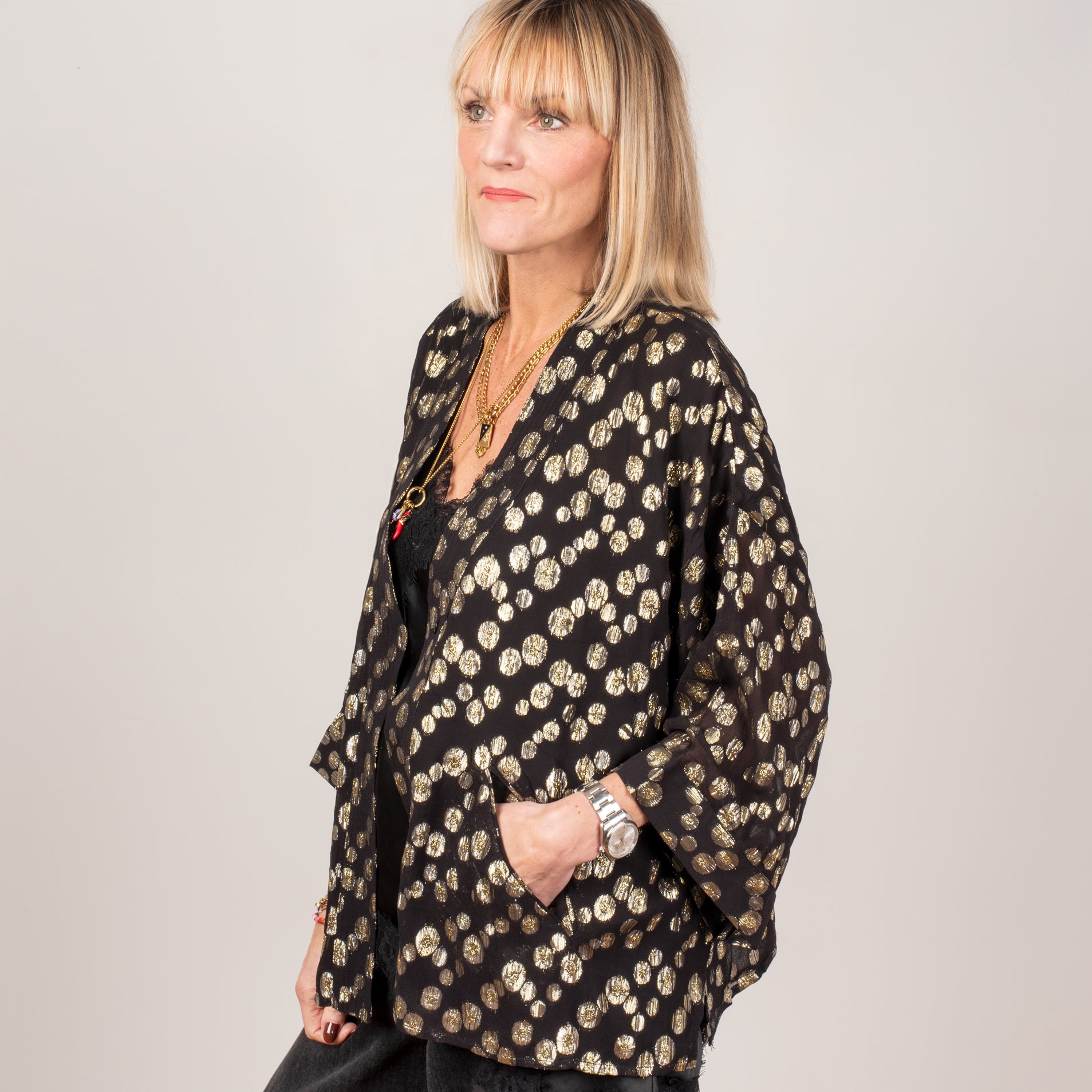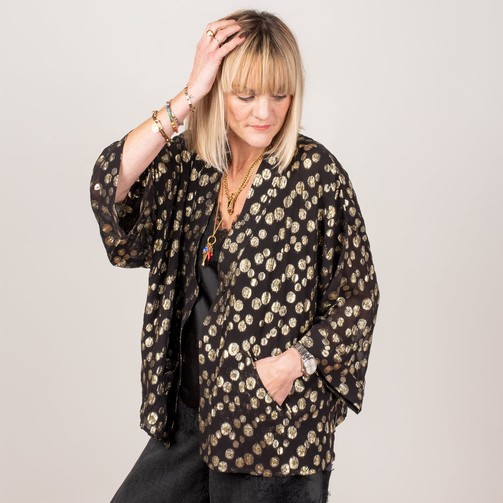 Made in a luxury viscose georgette fabric with a metallic jacquard within the fabric. This kimono is limited edition made by utilising dead-stock fabrics. Premium quality viscose fabric with a gorgeous drape to it and fully lined. This kimono also looks great over swimwear.