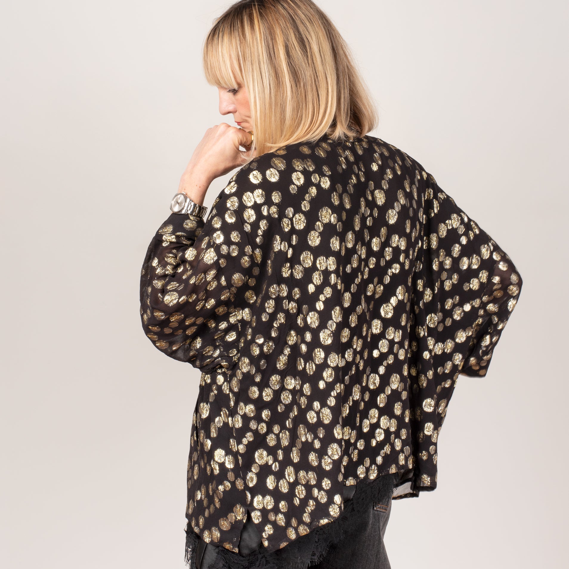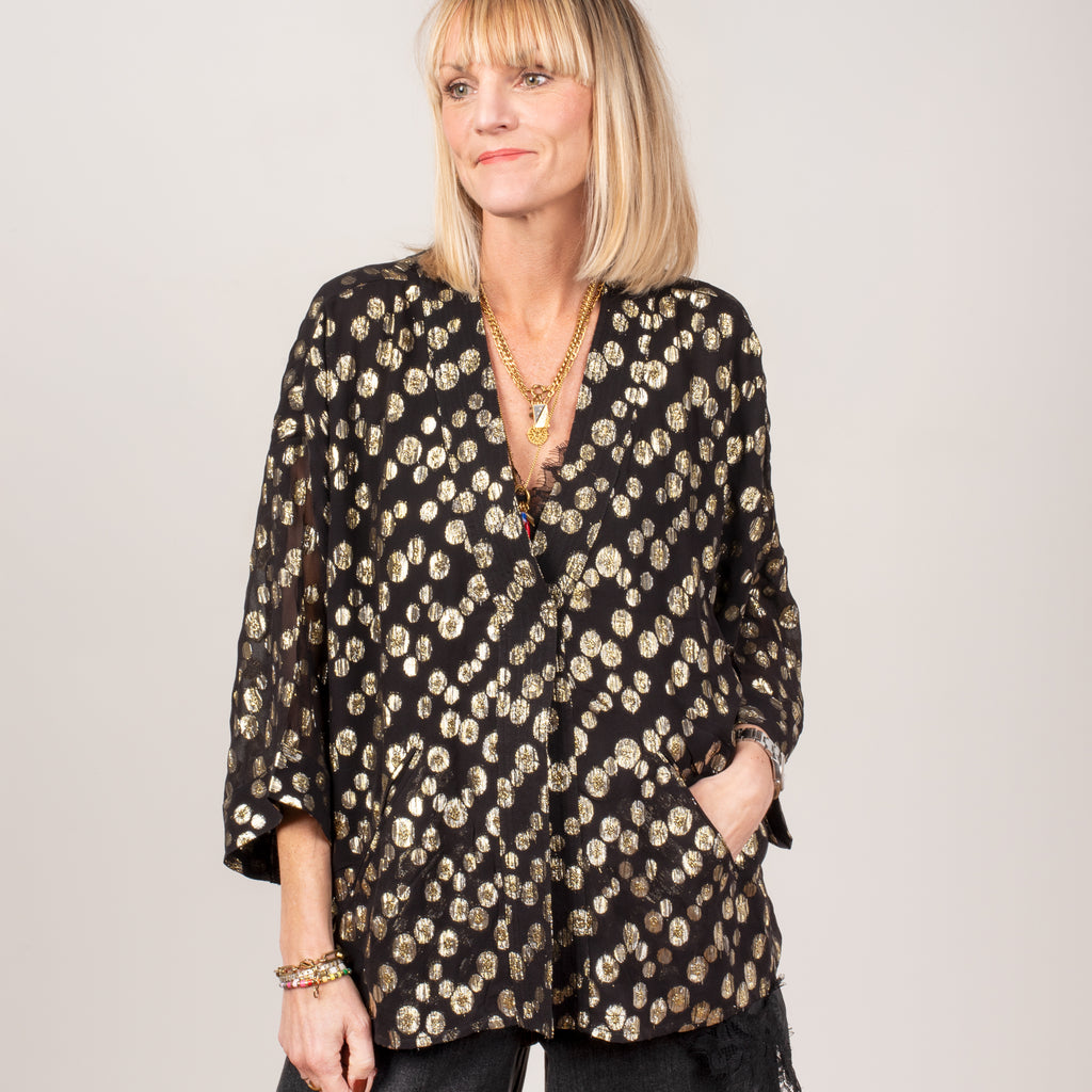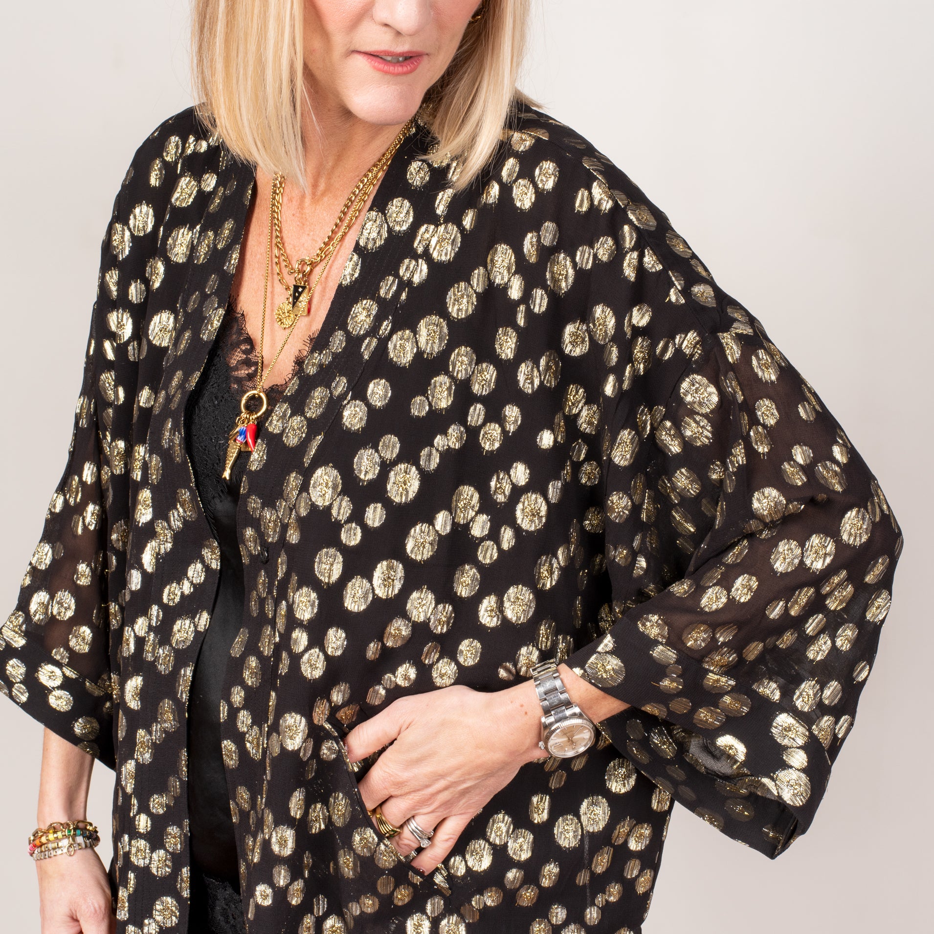 Made in a luxury viscose georgette fabric with a metallic jacquard within the fabric. This kimono is limited edition made by utilising dead-stock fabrics. Premium quality viscose fabric with a gorgeous drape to it and fully lined. This kimono also looks great over swimwear.