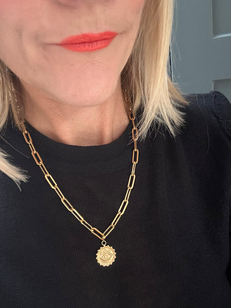 New in for Autumn and Winter 25! The Zadie pendant necklace. Magic eye charm with our best selling paperclip style chain. Gold plated stainless steel.