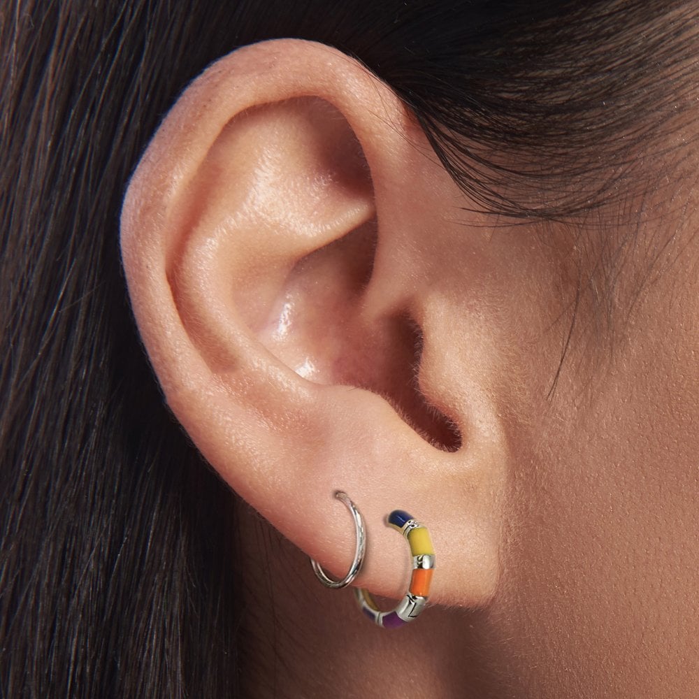 These delightful hoops boast a polished hoope adorned with sections of colourful enamel. Each earring has a spectrum of rainbow hues in green, purple, mauve, orange, yellow and blue.