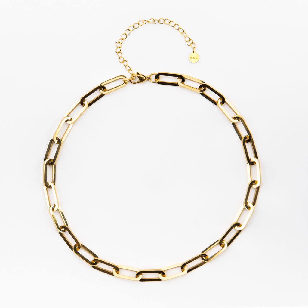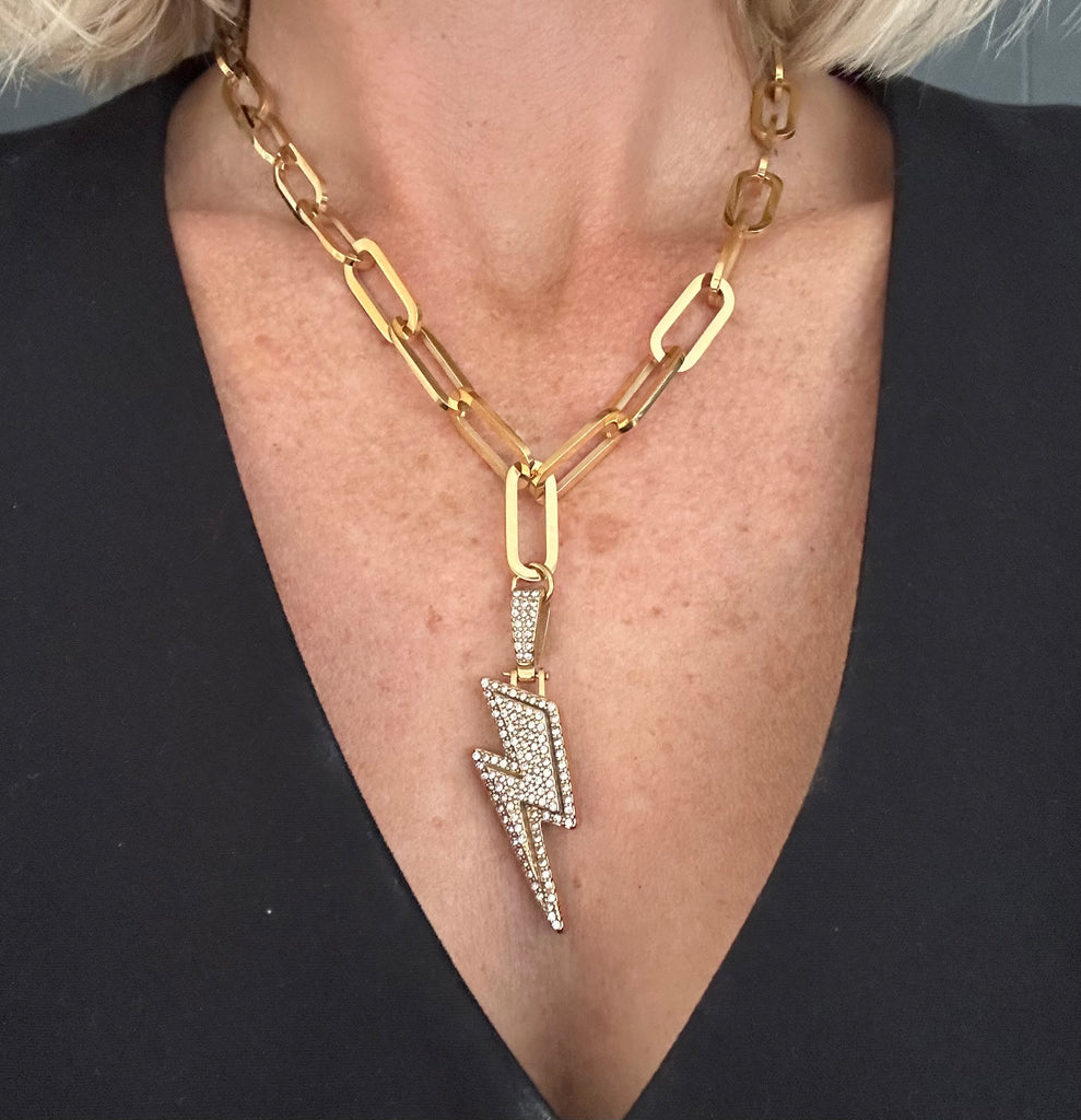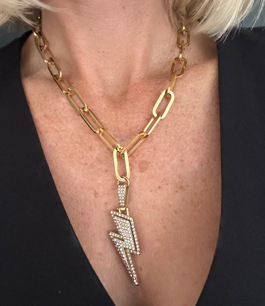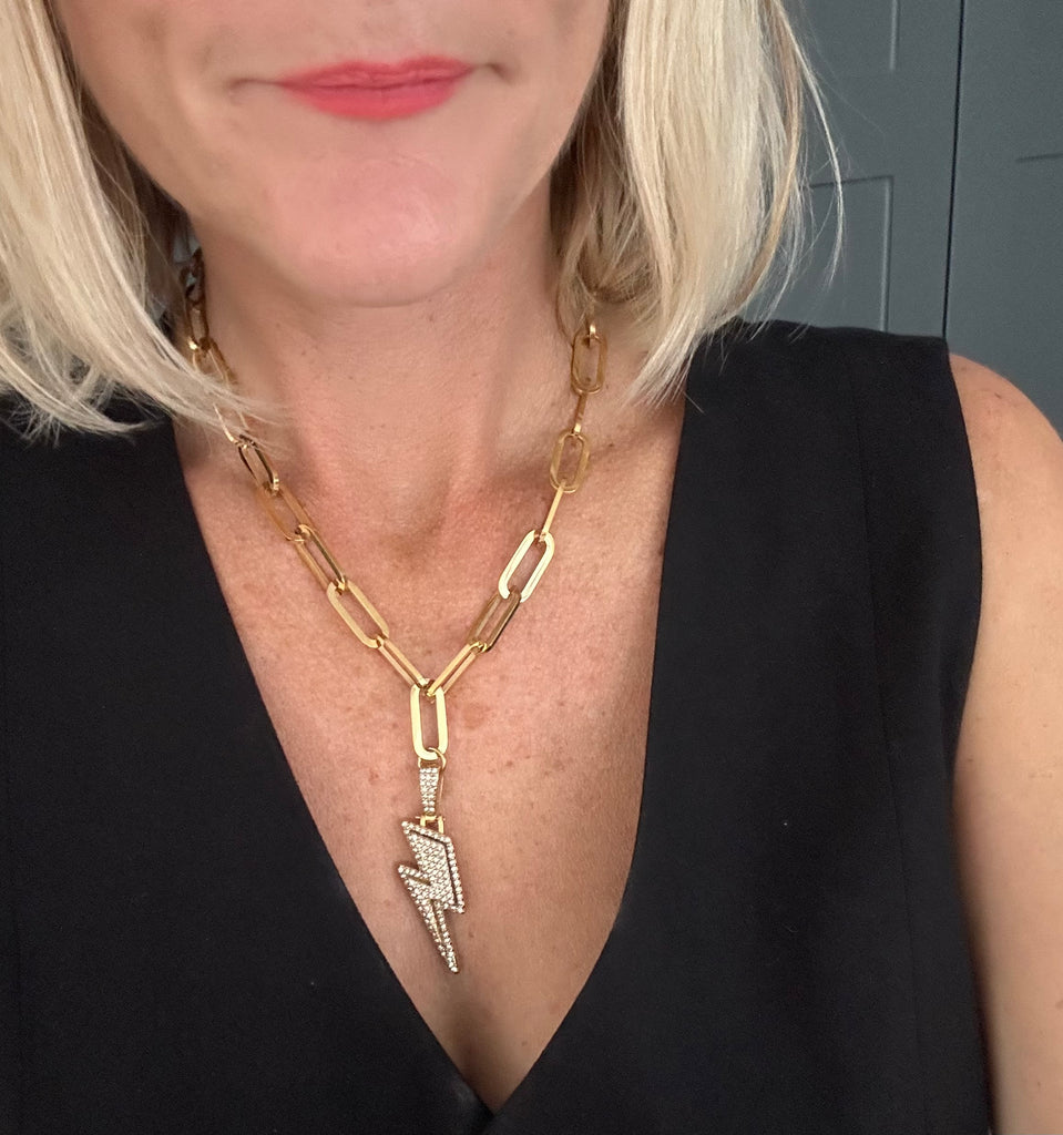 Hand finished here in the UK, this gold plated necklace with paper chunkier clip style chain and rhinestone embellished lightning bolt pendant. Length adjustable by 3cm drop can be 24cm to 28cm. Total length inclusive of the adjuster is 55cm. The full necklace length is 55cm (inclusive of 10cm adjuster). Chain link is 2cm wide. Charm is 5.5cm by 2cm.