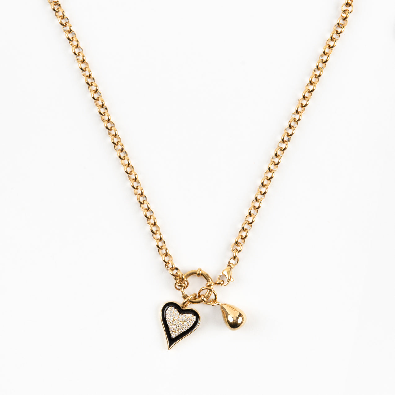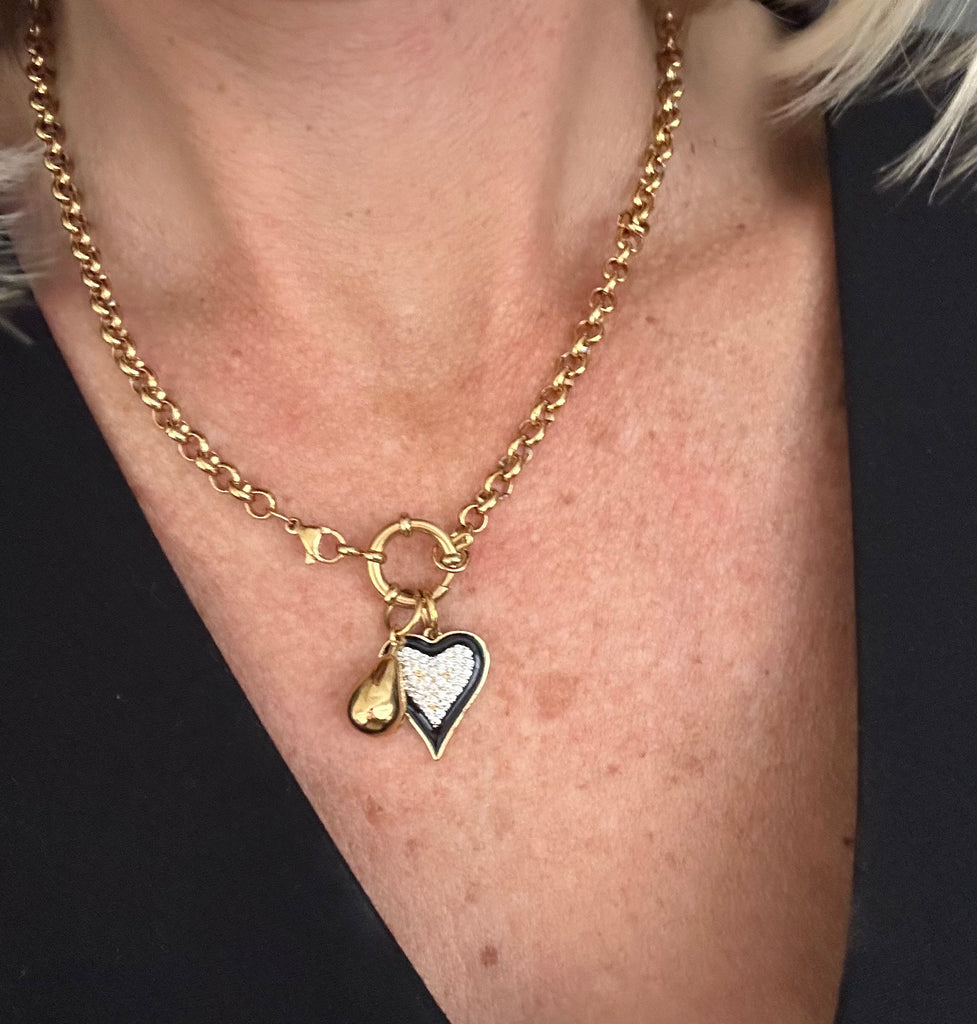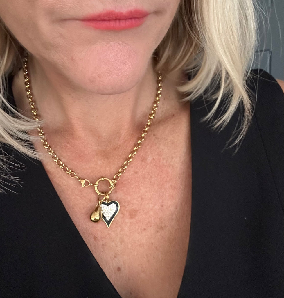Adding to our best selling charms collection with this cute heart with mini rhinestones and black enamel edging. The perfect pop of cuteness to any necklace! Measures 1.8cm by 2cm.