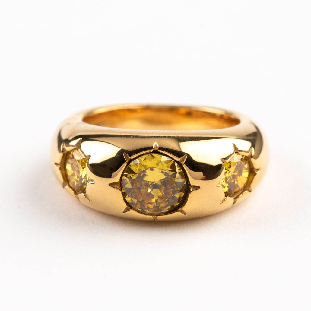Stainless steel gold plated 18K gold plated ring with yellow zircon stones inlay. Chunky and statement we love this new piece!