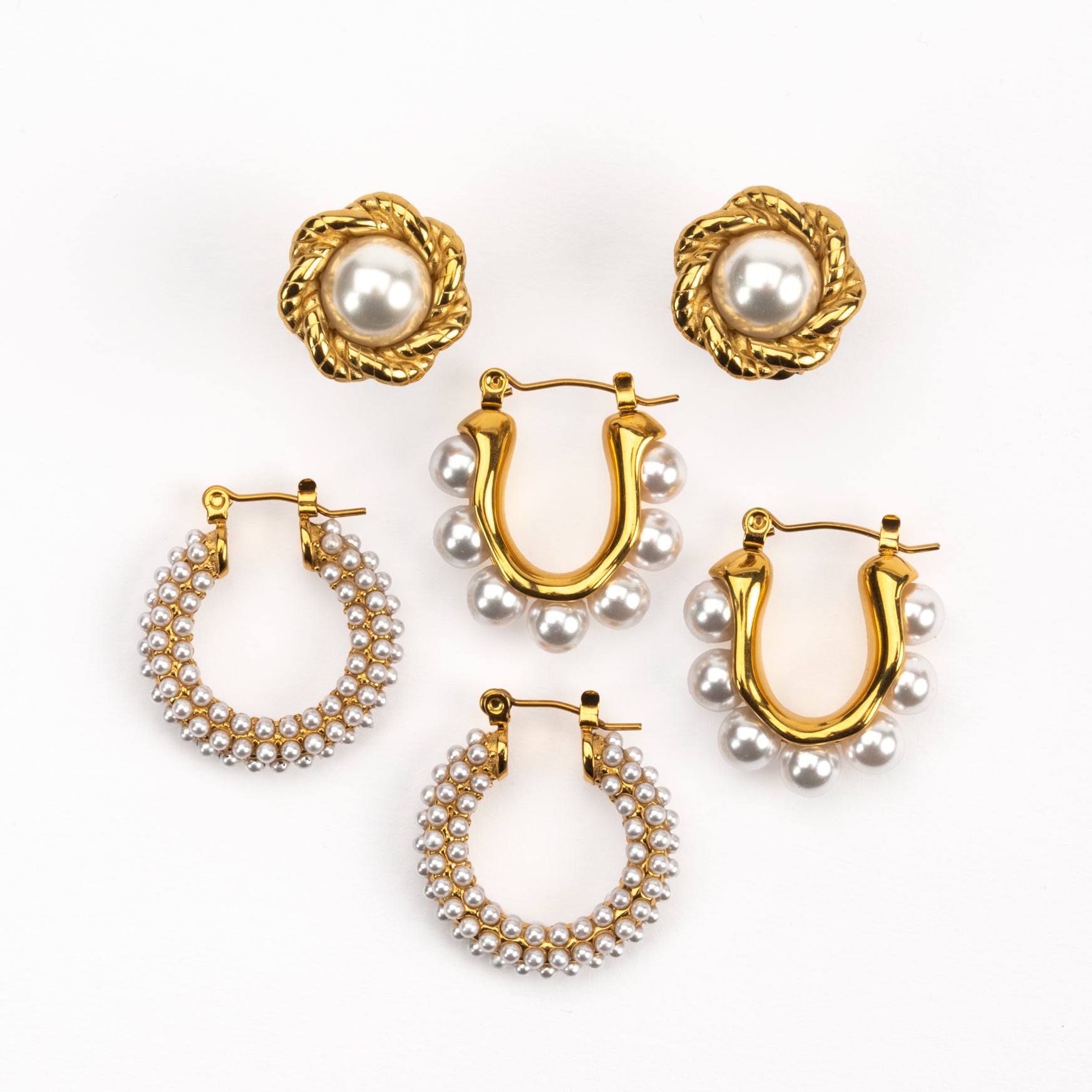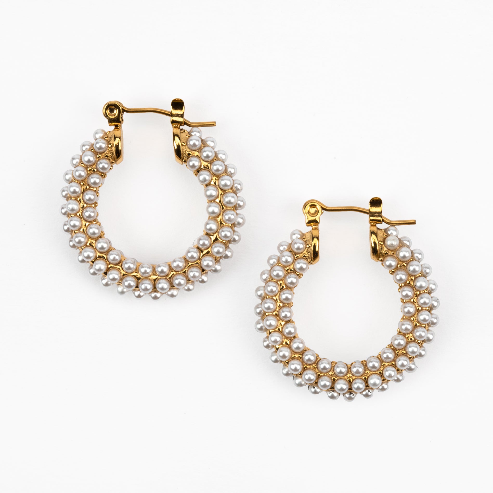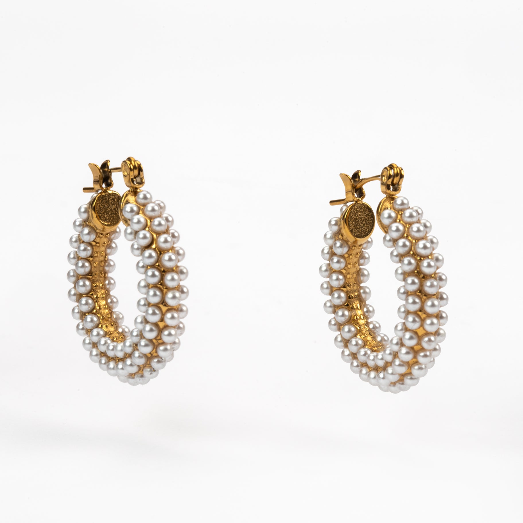 Giving us all the cool 80's Krystal Carrington vibes we love these hoops! 18 Carat Gold plated stainless steel hoop earrings with mini imitation pearls. Total drop is 2.5cm by 2.4cm.