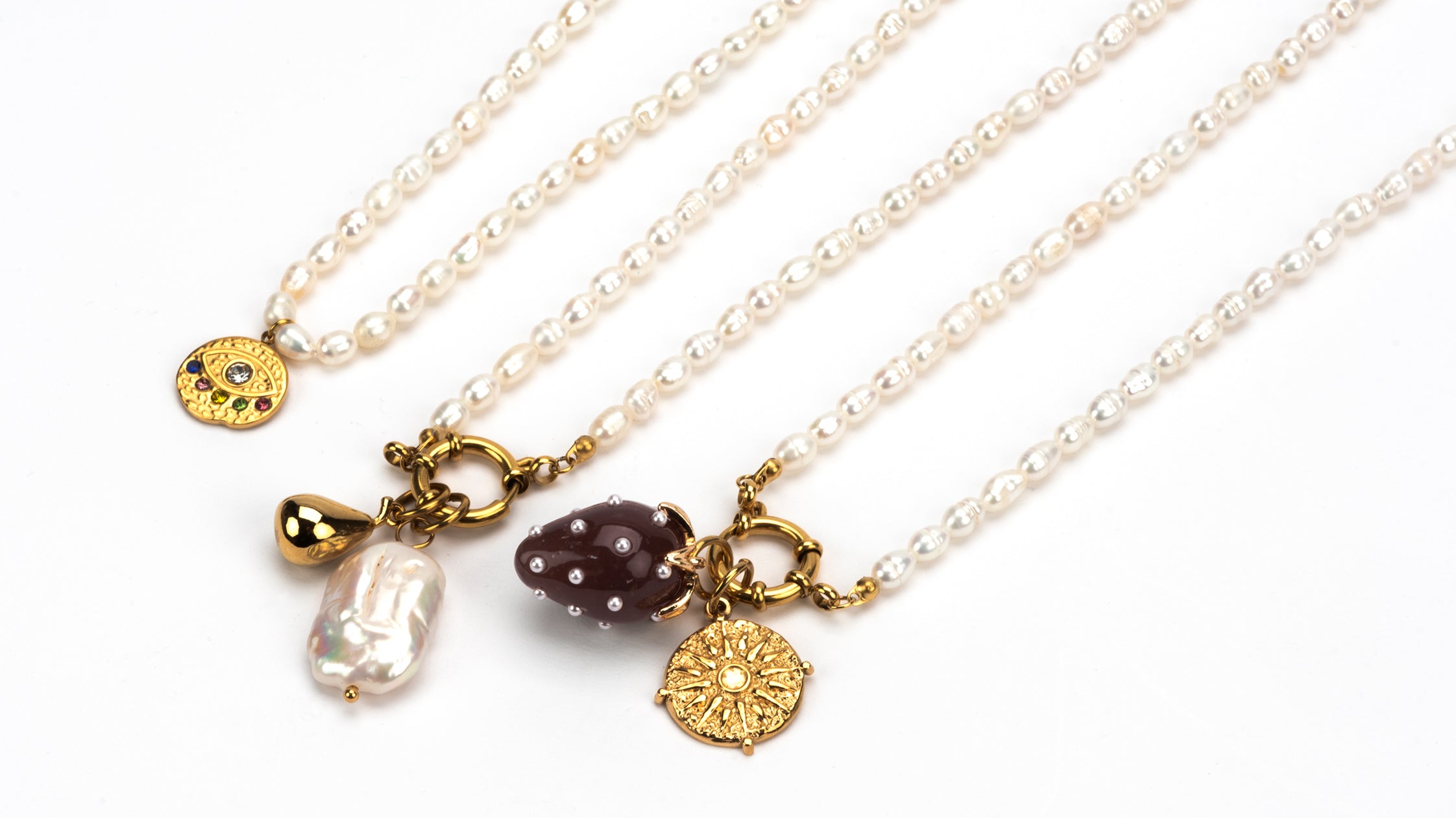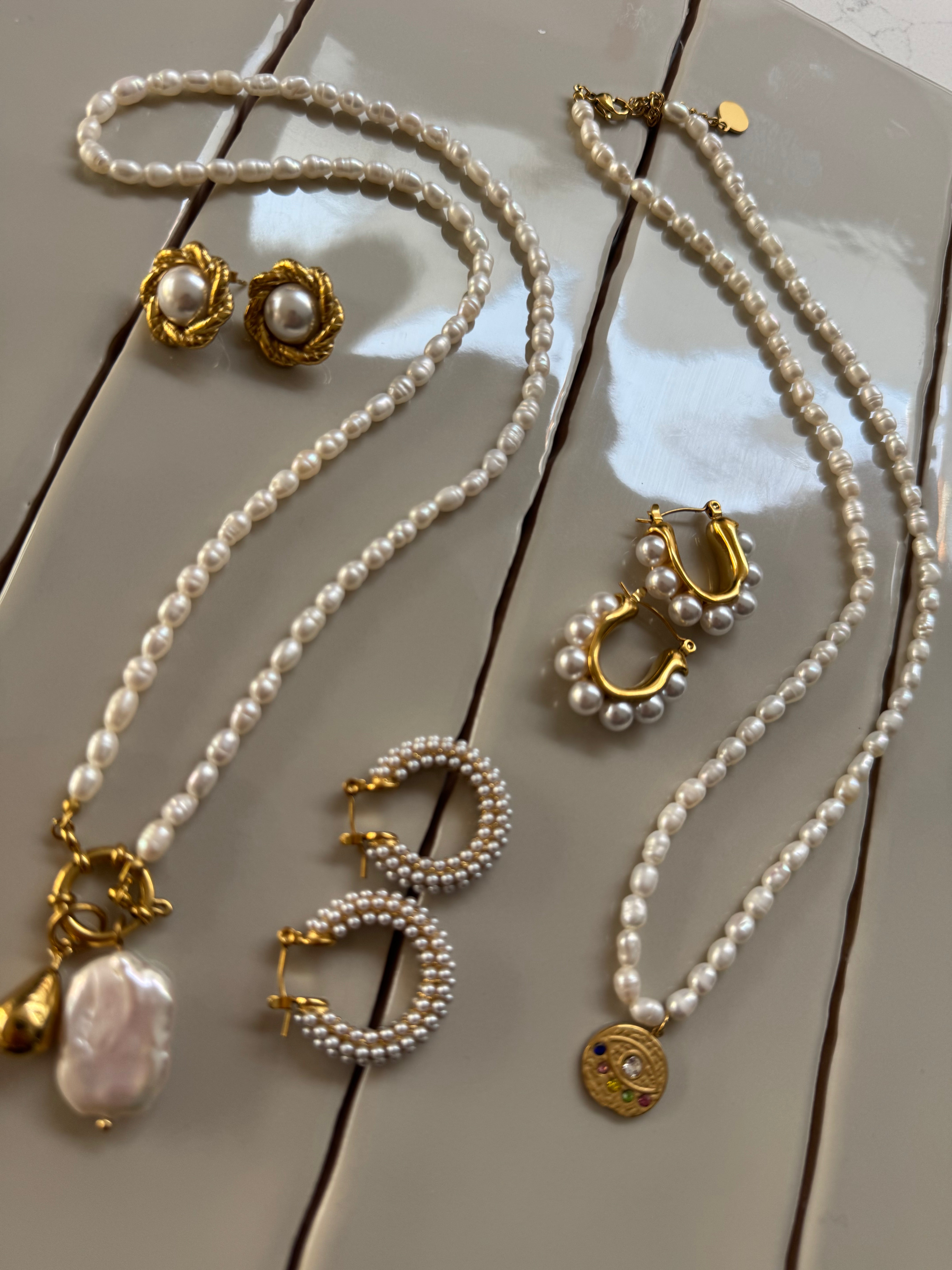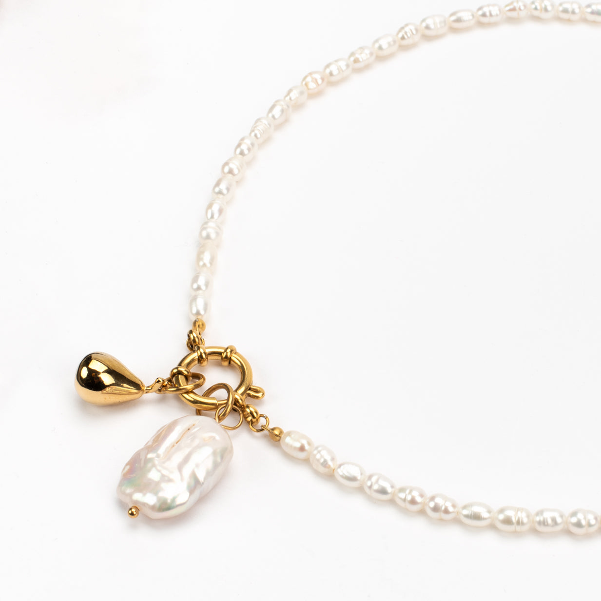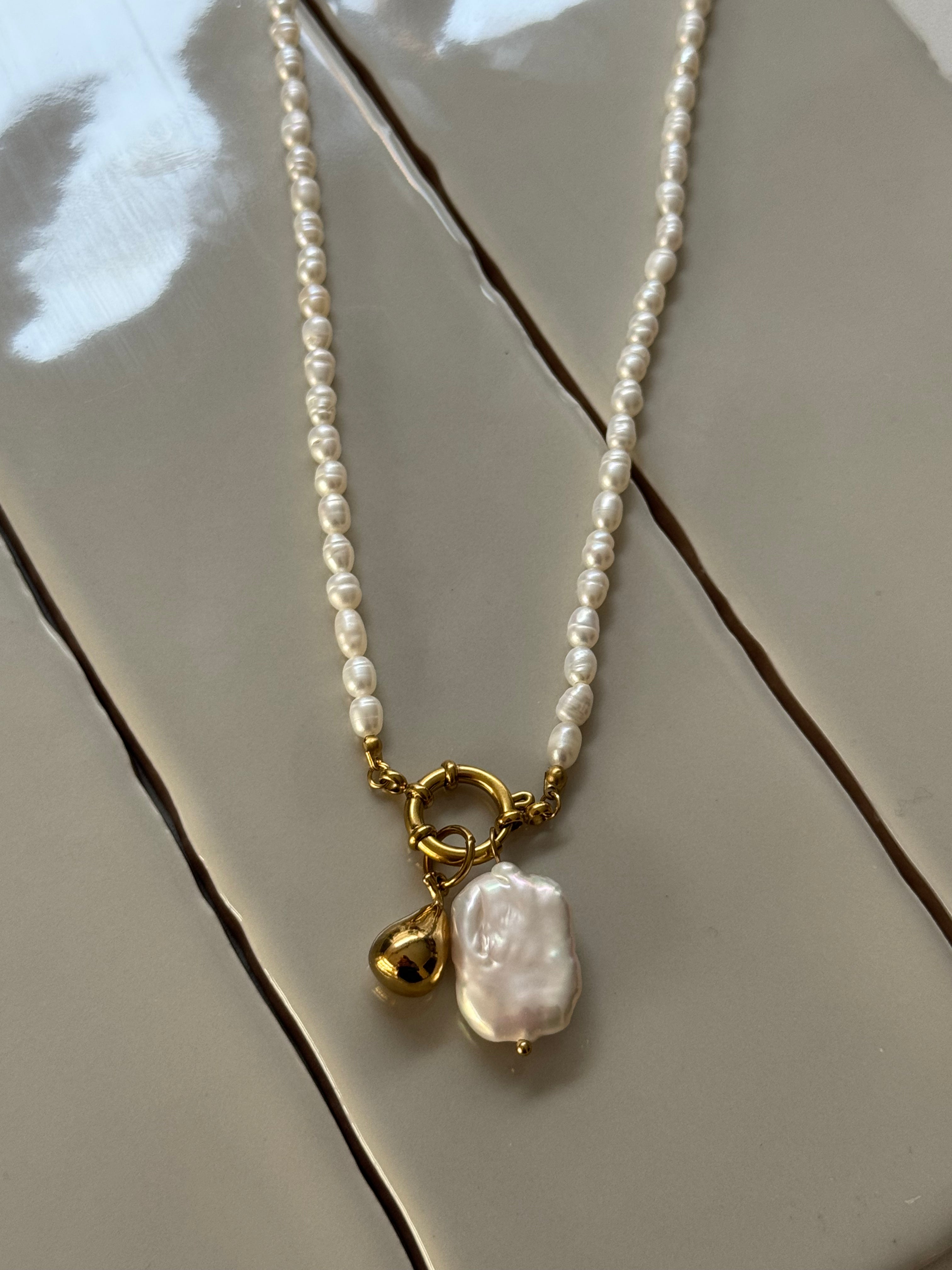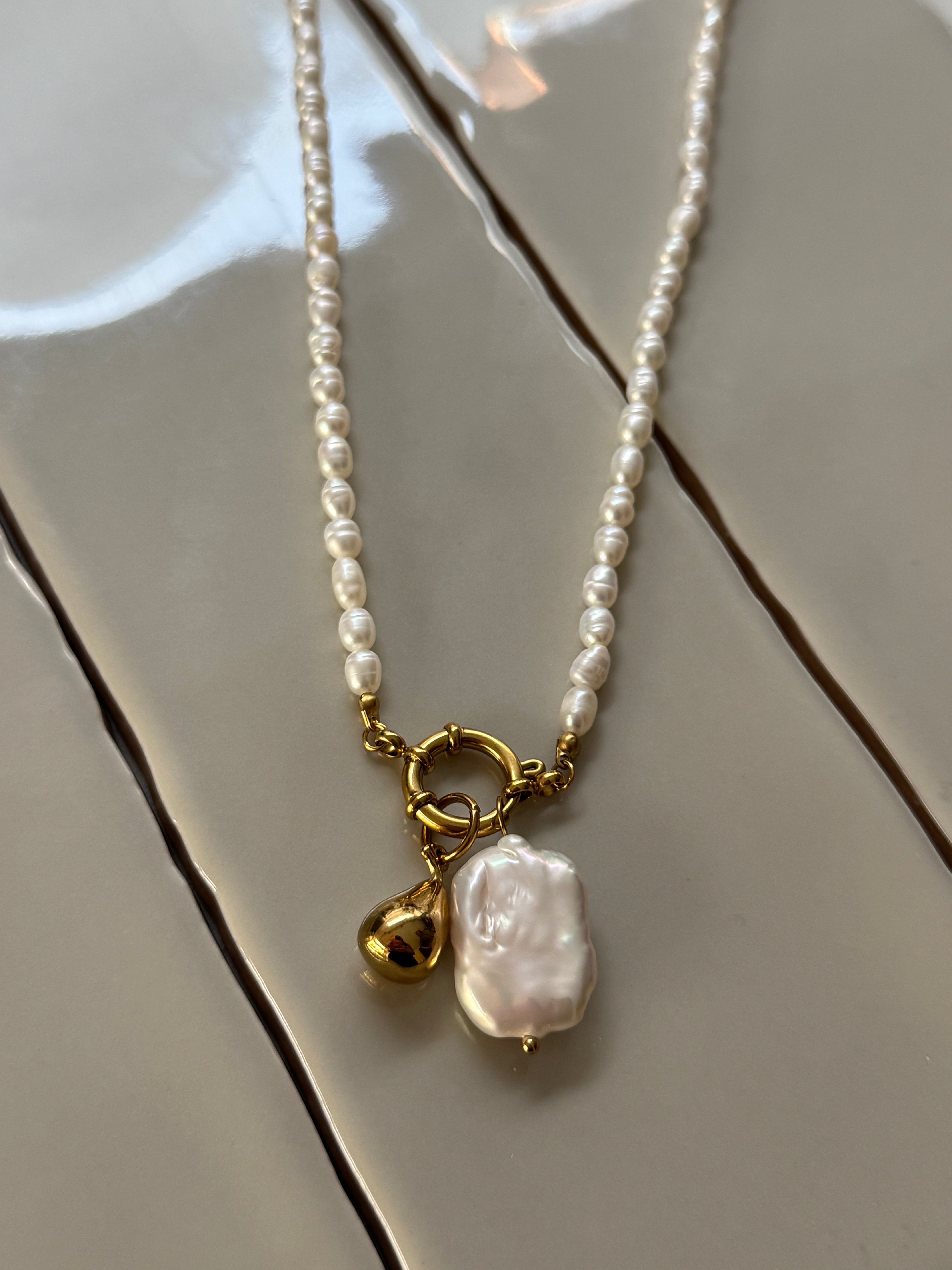 New in for Autumn and Winter 25! This Polly Pearl Charm necklace pre stacked with the gold plated pear and large pearl charms. The necklace is made with fresh water pearls and a gold plated charm clip. The charm is imitation pearl. Hand finished here in the UK. This would cost £79 if bought as separate pieces.