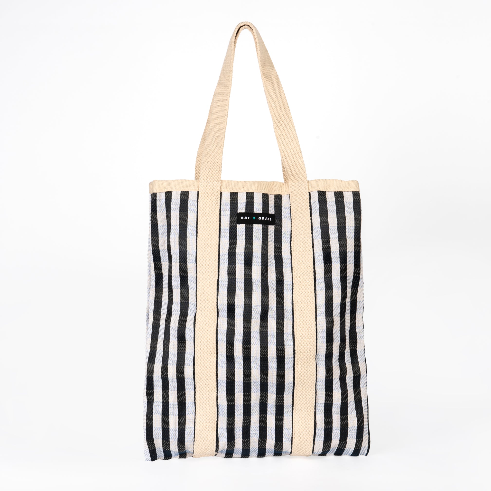 Striped shopper bag made from recycled plastic. Soft cotton straps that are super comfy to carry. Measures 47cm high, 40cm wide and 5cm deep. With an internal zip pocket big enough to fit your purse/wallet and phone. This bacg is a black and white stripe with a blue backing stripe which can give it a checked effect.