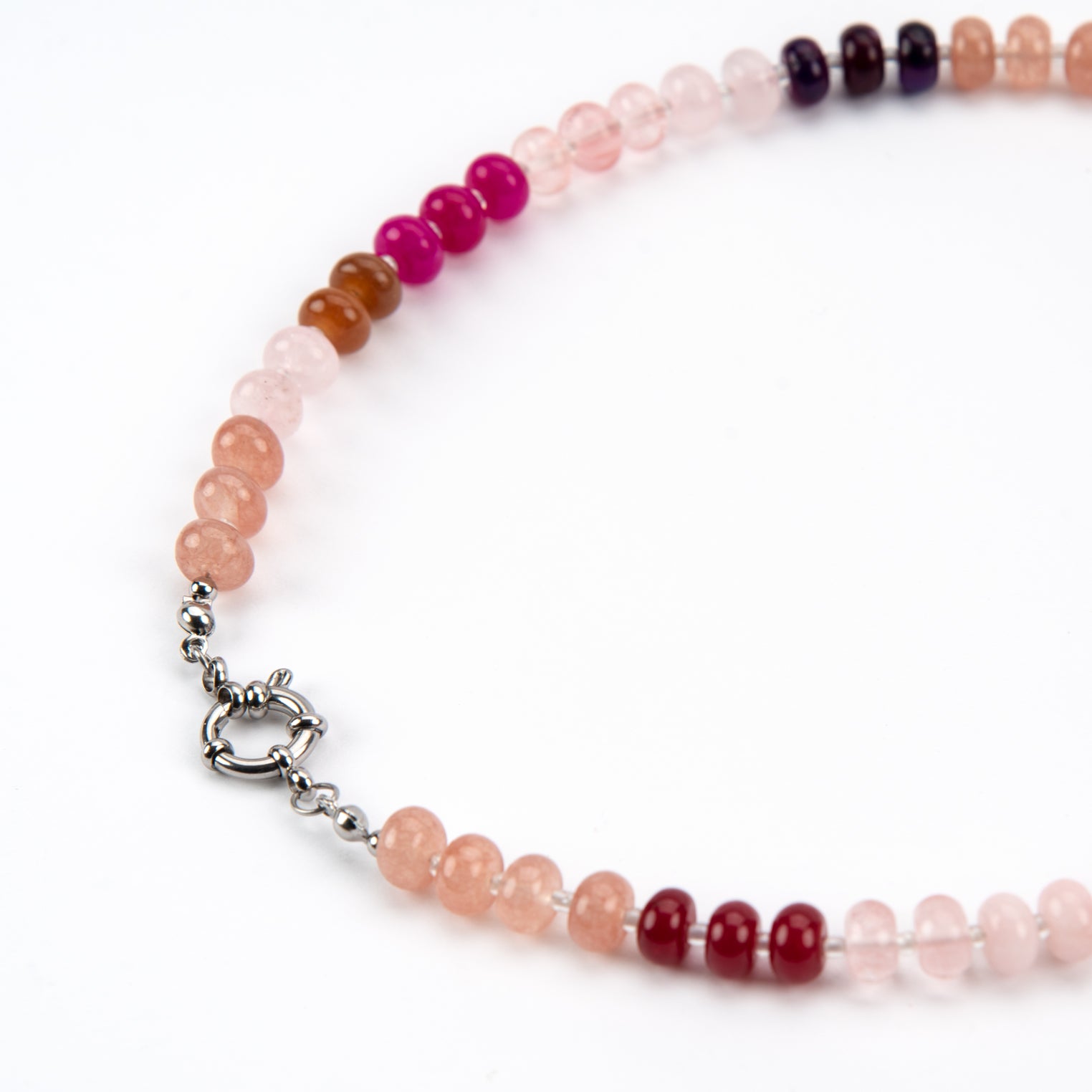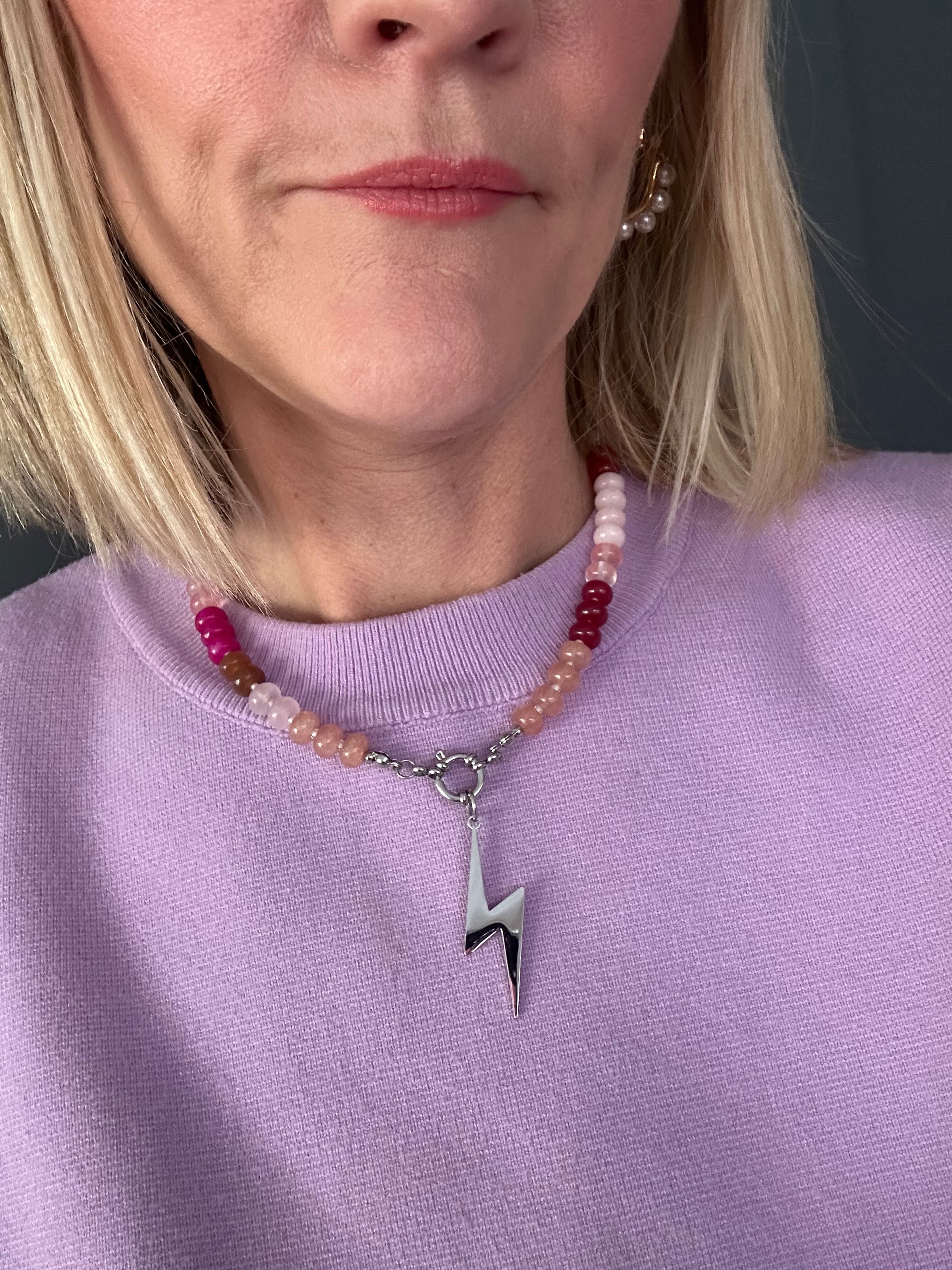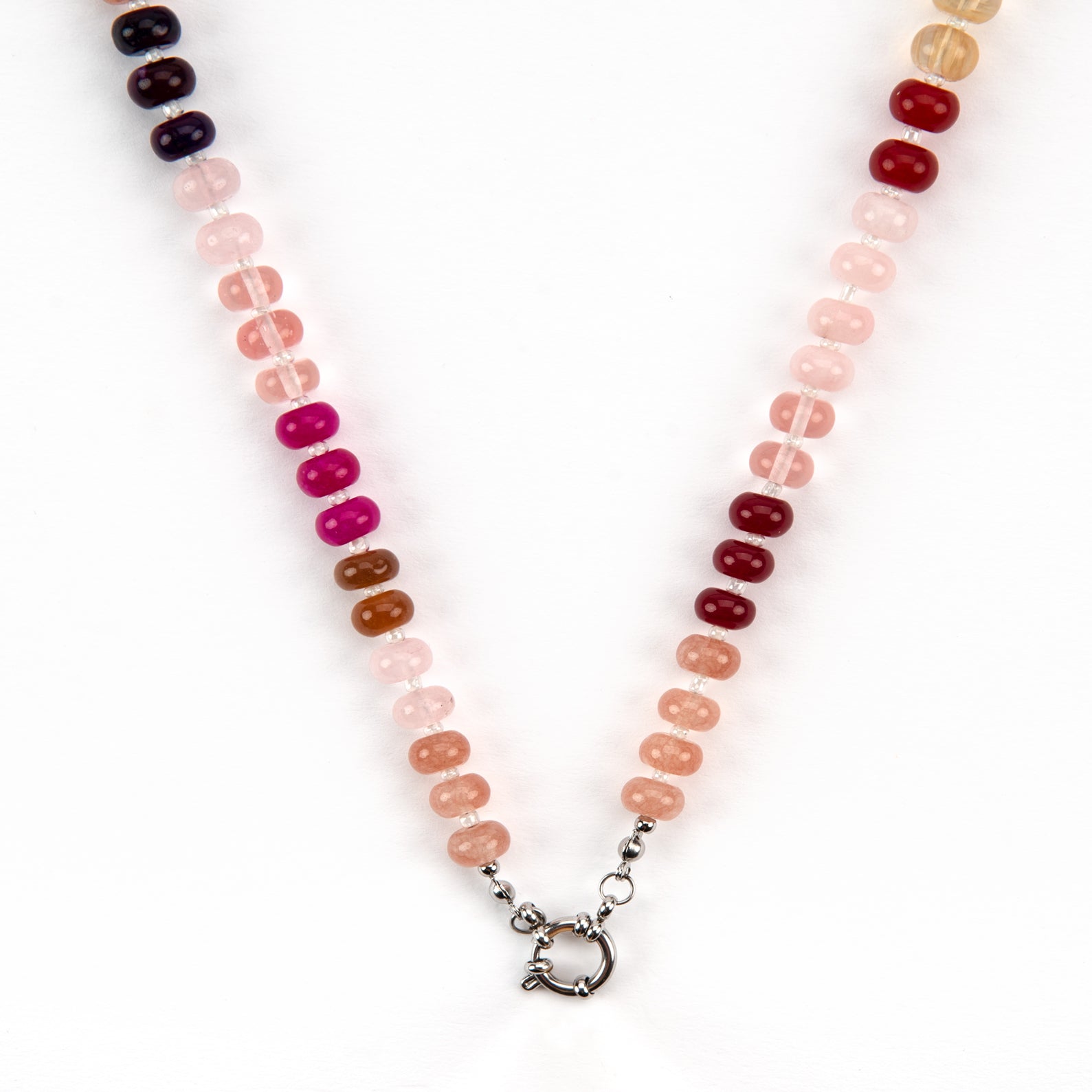 Meet our newest candy bead necklace, in our fave colour combination colours Summer berry tones of pink and red! with a central stainless steel clasp that you can add your choice of charms to.