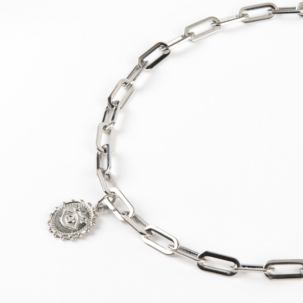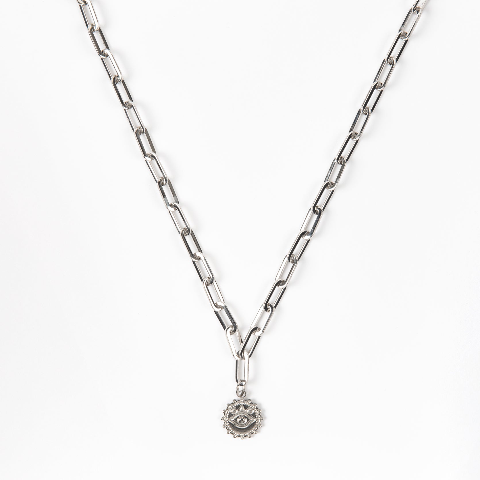 New in for Autumn and Winter 25! The Zadie pendant necklace. Magic eye charm with our best selling paperclip style chain. Made with stainless steel.